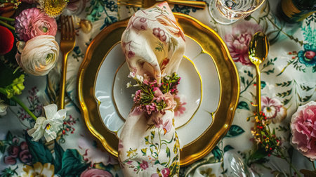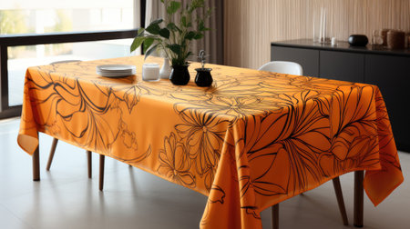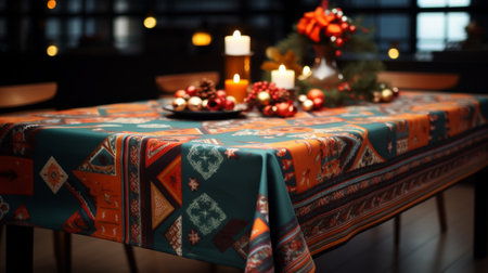 Sunlit patterned tablecloth in warm evening glow. That the image is generated using AI.