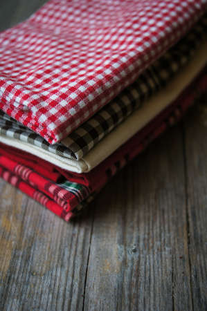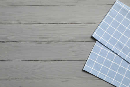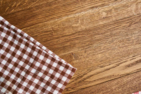 Kitchen towel or napkin over the rustic wooden table. View from above with copy space