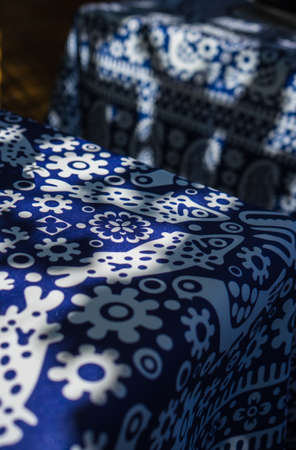 Detail of embroidered fabrics, textile crafts shop, close-up