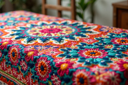 Vibrant mexican embroidered tablecloth with colorful floral patterns. That the image is generated using AI.
