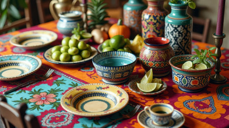 Colorful mexican table setting with traditional pottery and fresh produce. That the image is generated using AI.