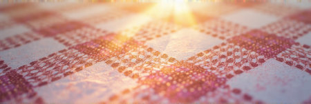 Sunlit red and white checkered tablecloth with soft sunflare. That the image is generated using AI.