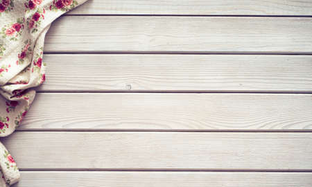 Vintage kitchen tablecloth on rustic wooden table made of white wood planks. Textured background with copy space for your advertising text message or promotional content.