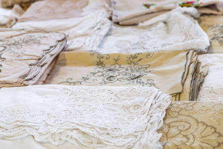 CESENA (FC), ITALY - SEPTEMBER 16, 2018: lights enlightening Tablecloths and sheets embroidered with lace at antiques fair in Cesena