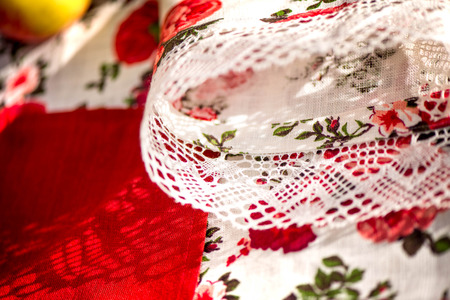 A macro shot of natural linen tablecloth with rose print and snow white crochet linen lace trim and red linen napkins. Shot is taken in the middle of autumn, during the sunset