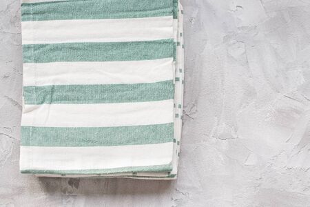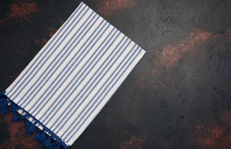 Folded linen striped kitchen towel on a black background, top view. Copy space