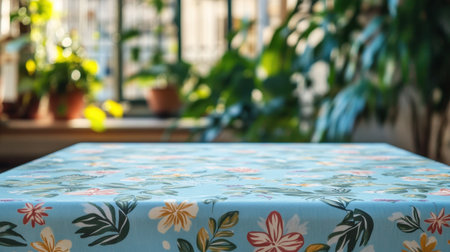 A vibrant blue tablecloth with floral patterns sits in a sunlit indoor garden, surrounded by lively green plants. A perfect touch for home decor.