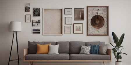 Modern scandinavian interior with photo frames, plants and decorations. Mock up, 3D Rendering