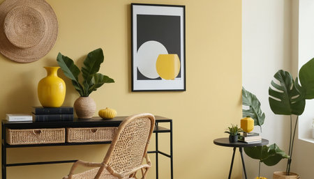 A modern yellow living room with a sofa and picture frames. Generative AI