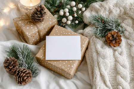 Warm holiday scene with wrapped gifts, pinecones, evergreen branches, and soft lights on a textured blanket.