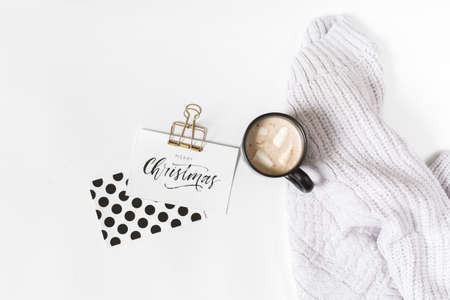 Flat lay composition with cup of hot chocolatehmallows, scarf and card with Merry Christmas text on white wooden background