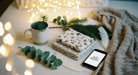 A cozy holiday scene featuring wrapped gifts, a smartphone displaying happy holidays, a mug, and greenery, with soft lights in the background