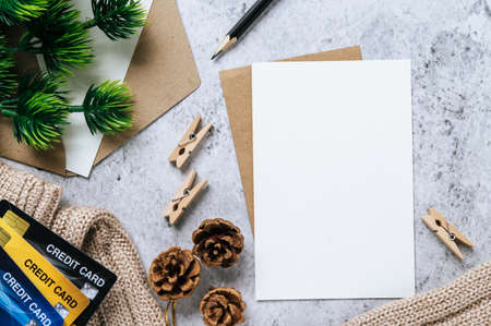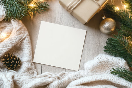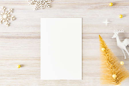 Blank white card surrounded by festive Christmas and winter holiday decorations. Blank white Christmas greeting card mockup with decorations