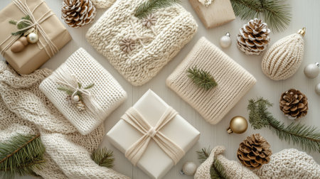 A cozy white knitted hat and scarf are placed on a rustic wooden table surrounded by pinecones. The features setting subtle winter decorations, creating a warm and inviting atmosphere.