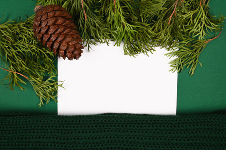 empty 5x7 card mockup kraft gift box with fir decoration on knitted green sweater, design element for wedding invitation, thank you or greeting card. Christmas winter card mock up background