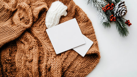 Two empty business cards rest on a textured knitted sweater, complemented by pine branches and red berries, evoking a warm and inviting winter setting.