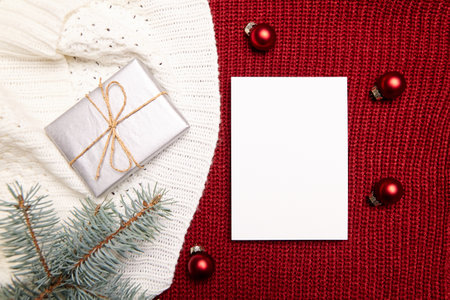 Christmas greeting card mockup with gift box and decorations on red knitted background