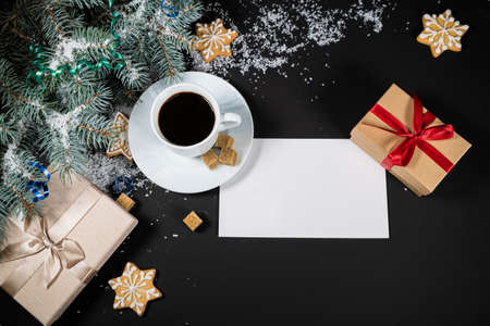 Magical christmas theme background, pine cones, coffee, cookies and an empty letter to santa on wooden table