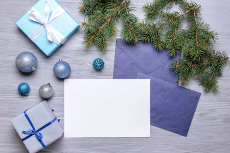 Beautiful Christmas gifts with empty card and envelopes on wooden background