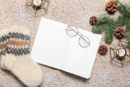 Opened book with blank pages, eyeglasses, knitted socks and winter decor on fluffy fabric background