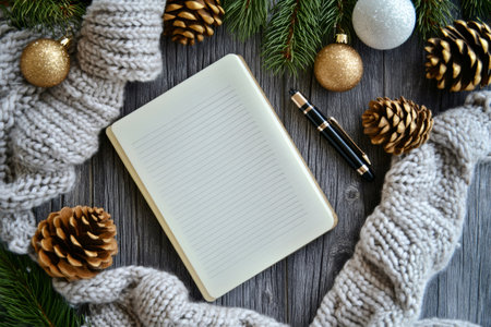 Cozy flat lay of Christmas planning in a notebook with festive decorations, a warm scarf, and an elegant pen on rustic wood