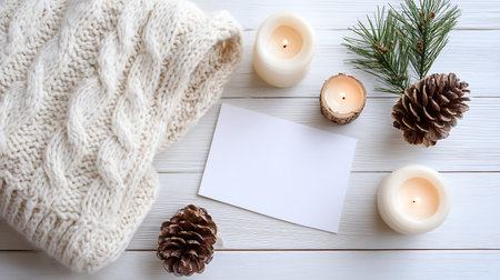A cozy winter scene featuring a knitted beanie, candle, pine cones, and holiday decor, perfect for evoking warmth and festive spirit during the season.