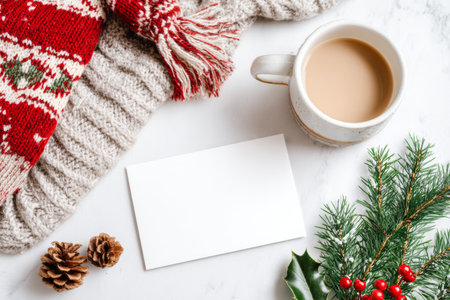 A blank card set in a cozy, warm atmosphere with a knitted scarf and steaming tea.
