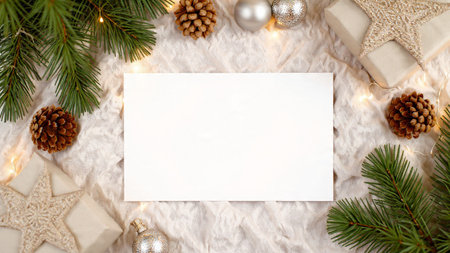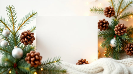 Christmas mockup white card template background with xmas festive seasonal decoration ornaments Generative AI Illustration.