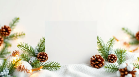 Christmas greeting card mockup with fir branches, pine cones and garland lights on white background