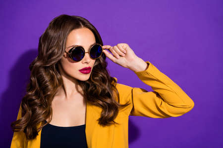 Stylish young woman yellow fashion sunglasses hoop earring quilted blouse striped jacket confident pose vibrant background summer portrait