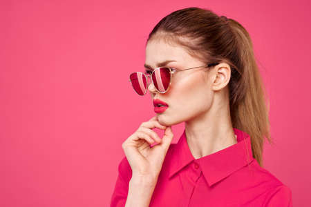 Woman in pink shirt and brown glasses cropped view fashion model emotions gesturing hands portrait