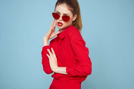 Woman in red shirt on blue background holds hands near face and sunglasses red lips makeup model