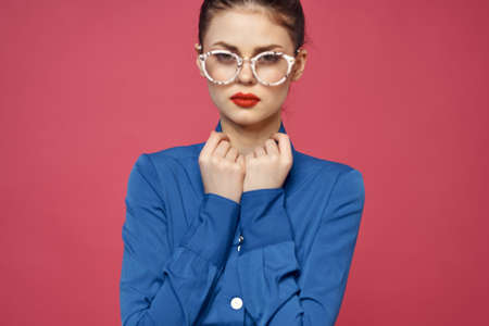 Portrait of a woman in glasses and in a blue shirt red lips pink background model