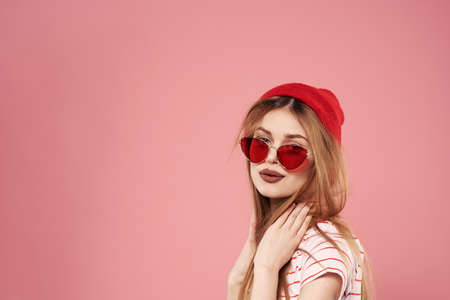 woman wearing sunglasses pink hat fashion modern style posing gray background