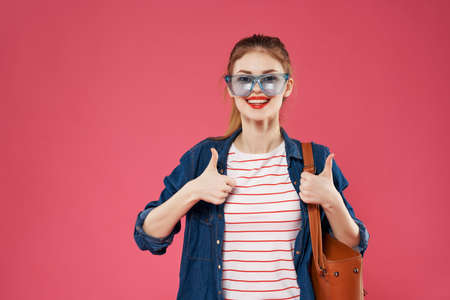Fashionable glamorous woman in red hat backpack student hipster pink background