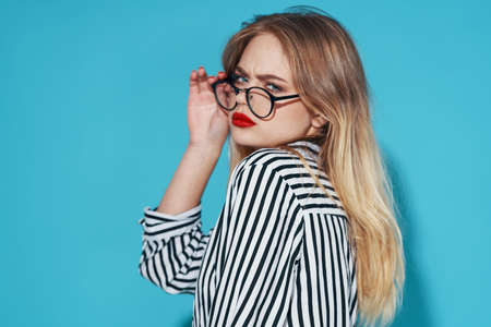 attractive woman wearing glasses striped shirt fashion posing in blue background