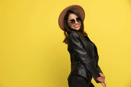 sexy young woman in leather jacket wearing sunglasses and hat, holding hands and smiling, standing in a side view position on yellow background