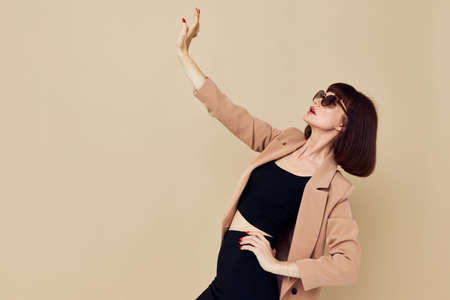 photo pretty woman in a beige jacket elegant style sunglasses isolated background