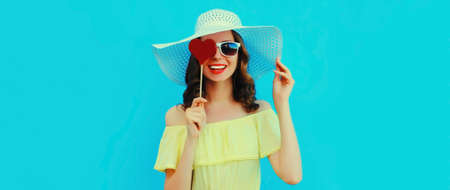 Portrait of happy smiling young woman with red sweet heart shaped lollipop wearing a summer straw hat on blue background