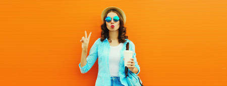 Portrait of beautiful young woman blowing her lips sending sweet air kiss with cup of coffee wearing summer straw hat on orange background, blank copy space for advertising text