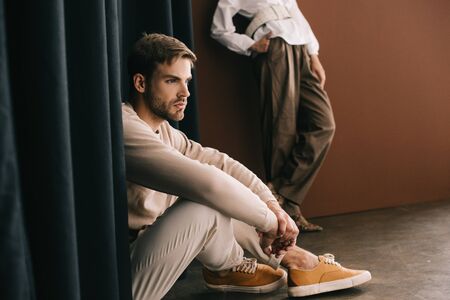 cropped view of woman standing with hand on hip and bearded man sitting near curtain