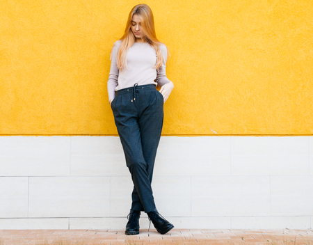 close-up of a young stylish girl in gray trousers standing with her hand in her pocket against a white wall