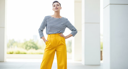 Fashionable Person in Striped Pants and Orange Jacket Posing Against a Vibrant Orange Wall