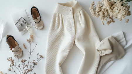 This flat lay features a stylish neutral outfit with cream pants, chic footwear, and elegant accessories, perfect for a modern and trendy look.