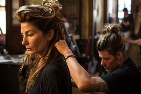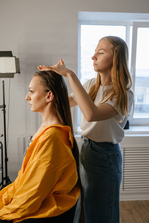 A model poses while a stylist skillfully arranges her hair in a well-lit studio setting.
