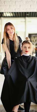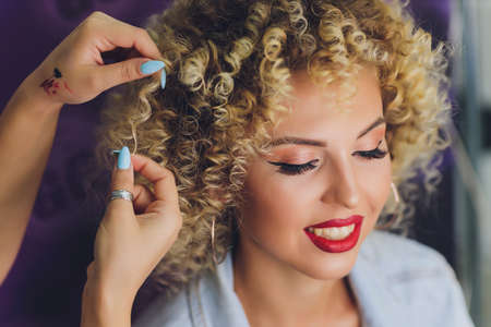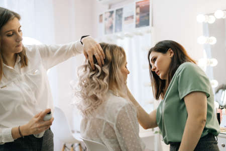 Young woman in hairdressing salon doing hair styling. High quality photo
