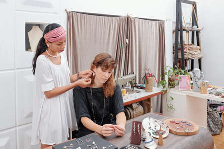 Handmade jewelry workshop owner helping young woman to choose earrings