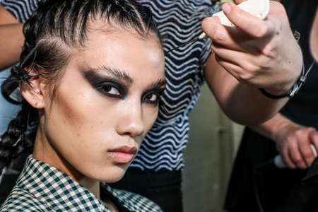 Backstage scene: Professional Make-up artist doing glamour model makeup at work.