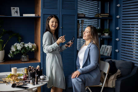 Beauty salon - makeup artist and blonde model near mirror in the dressing room
