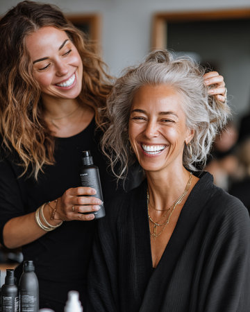 Portrait of happy mature woman in beauty salon with her hairdresser